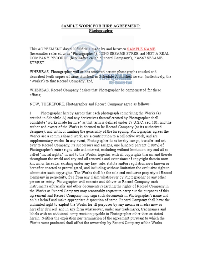 WORK FOR HIRE AGREEMENT This Work for Hire Agreement this Agreement is made effective as of In this Agreement the party who is contracting to receive the services shall be referred to. Ensure that both you and your contractor start on the right track with the use of our Work for Hire Agreement Template. It must explain clearly whether.